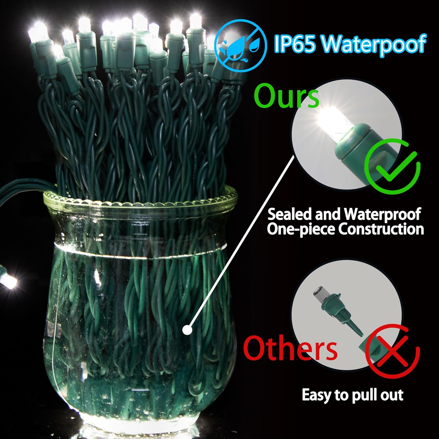 UL Commercial Grade LED String Lights: 50 counts White 5mm wide angle stable LED Christmas lights spaced 6 inches apart with green wire. 6 inch leads have a stackable male plug and 6 inch tails have a female plug for easy end to end connection.