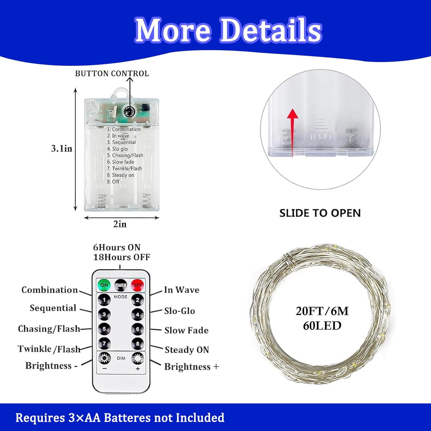 Battery Operated Fairy Lights with Remote & Timer Function: Enjoy ​twinkle lights battery operated magic with 8 customizable modes and adjustable brightness levels (Combination, In Wave, Sequential, etc.). The included ​fairy lights with remote feature dual controllers for convenience, while the timer function supports 6hrs on/18hrs off cycles. Perfect for creating ambiance in any setting!