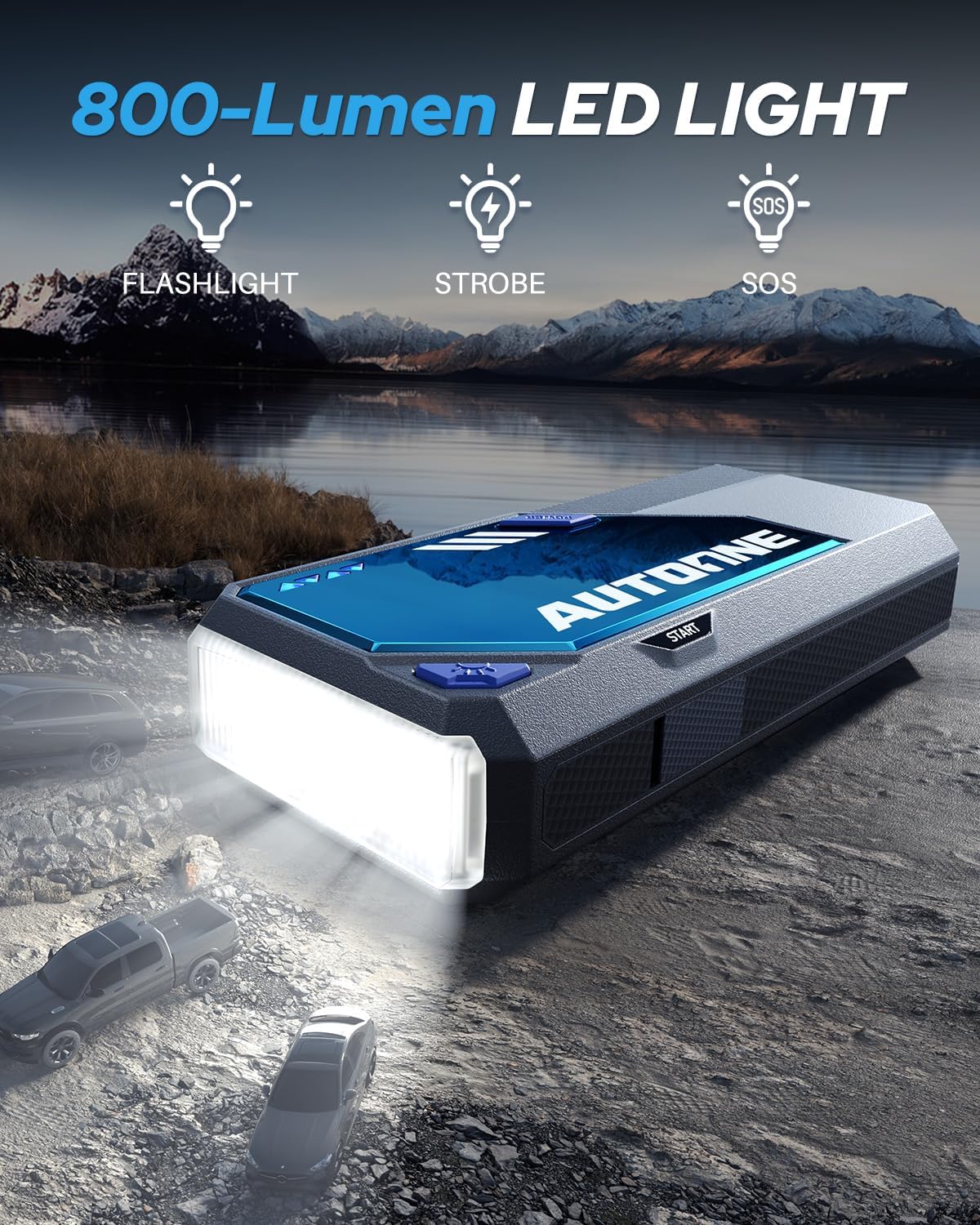 True 16,000 mAh & 7500A Peak – What you see is what you get! AUTOONE M4 battery jumper starter portable delivers a real 16,000 mAh capacity and 7500A peak current—enough muscle to crank up to All gas and 12L diesel engines on demand, no slowdown.