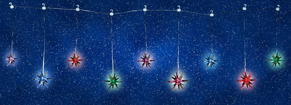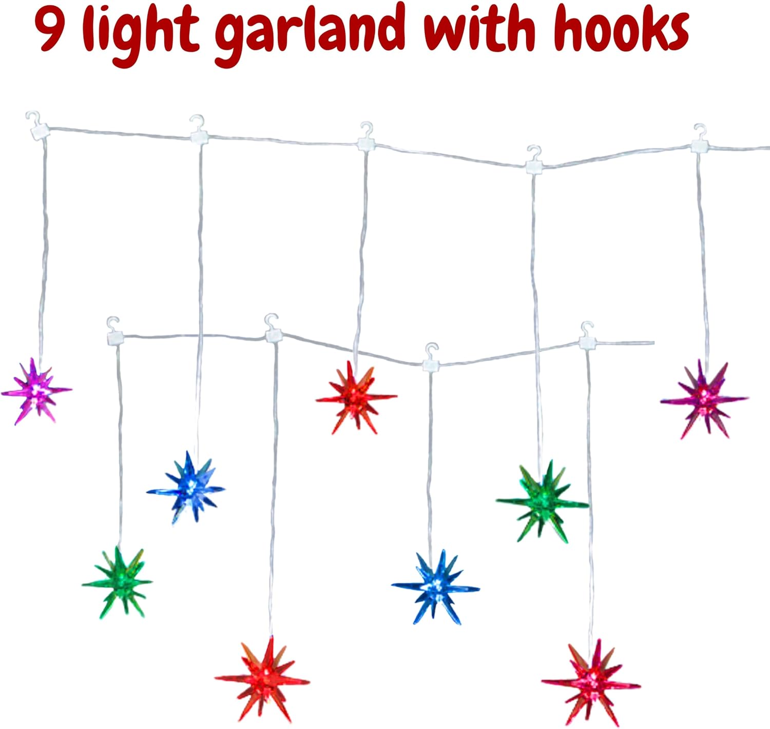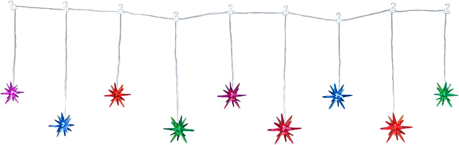 Lighted color changing starburst LED strand consists of 9 acrylic multi color light changing stars and is 48″L . Each star is 4 inches in diameter and the stars are spaced 5 inches apart. There is a 12 foot lead-in cord so the unit may be placed in a higher location.