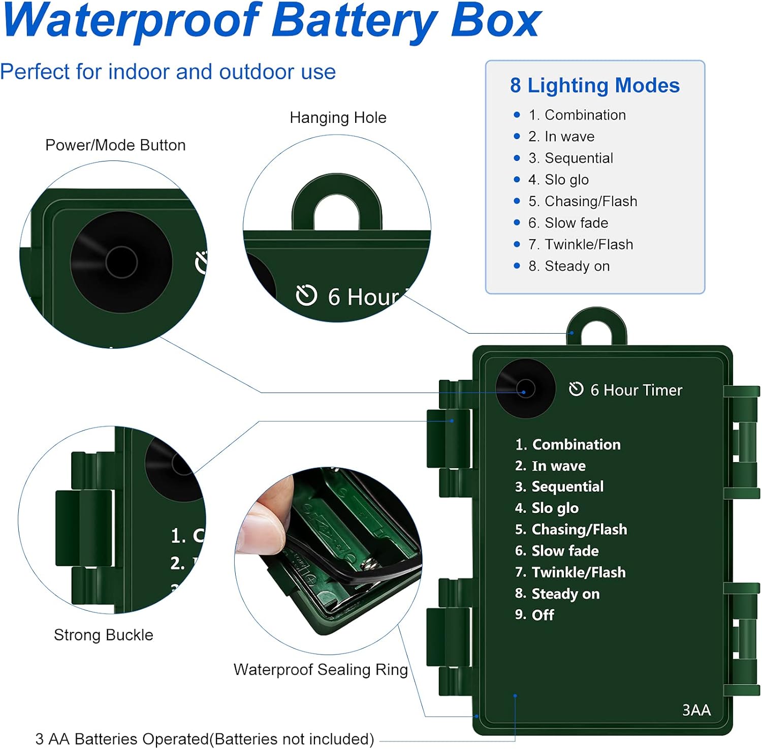 Outdoor and Indoor Christmas Lights: Battery box and string lights are waterproof(3*AA size battery, NOT INCLUDED), these are perfect to use on indoor and outdoor. Easy and great decor for Christmas tree, outdoor trees, wreaths and garland.