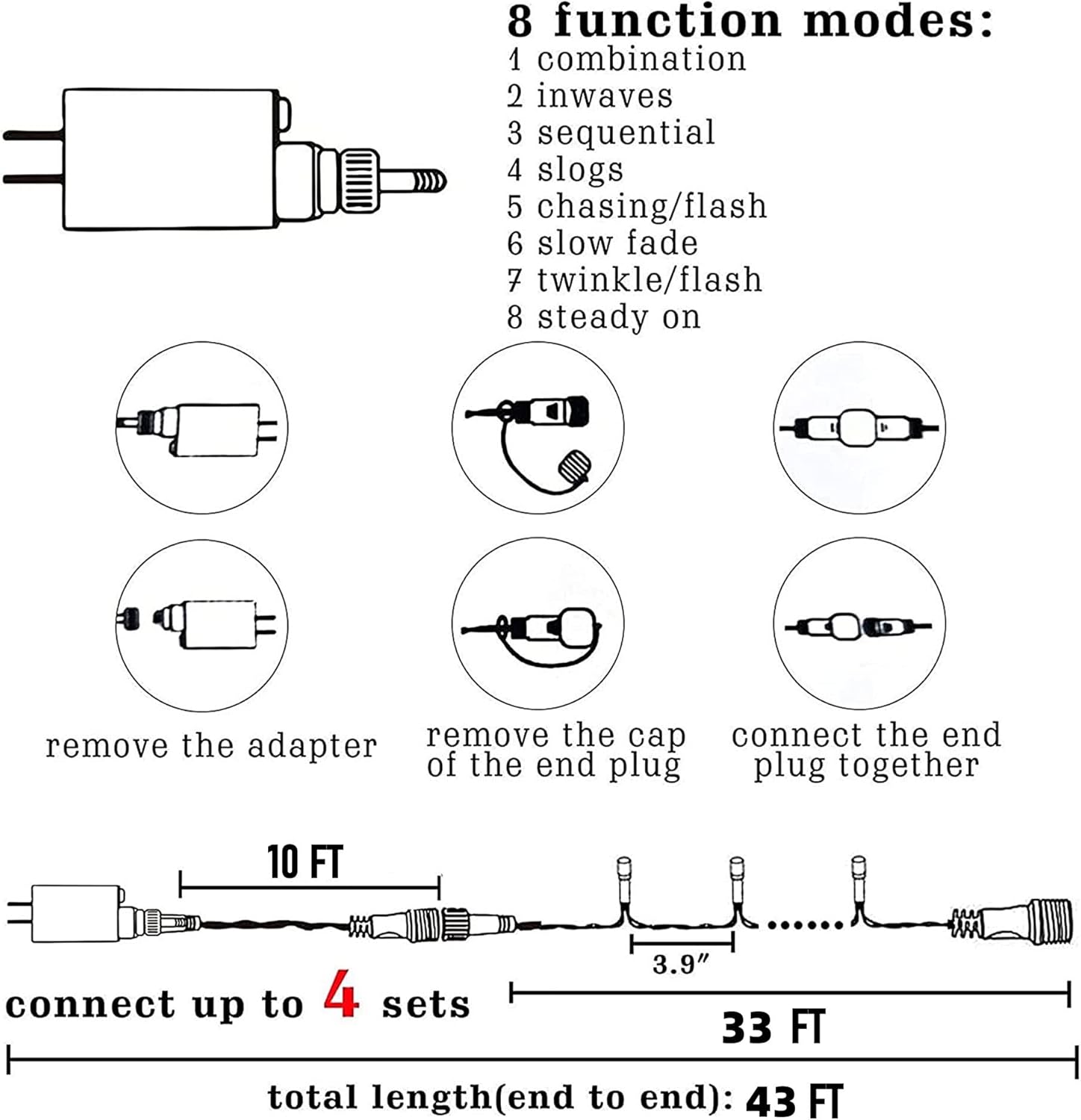 8 Lighting Modes Christmas Lights: 8 Modes (combination, in wave, sequential, slo-glo, chasing/flash, slow fade, twinkle/flash, and steady on). You could use different modes of the 100 LED lights according to different occasions, light up a unique outdoor & indoor illuminated backdrop for your vivid and funny decorations.