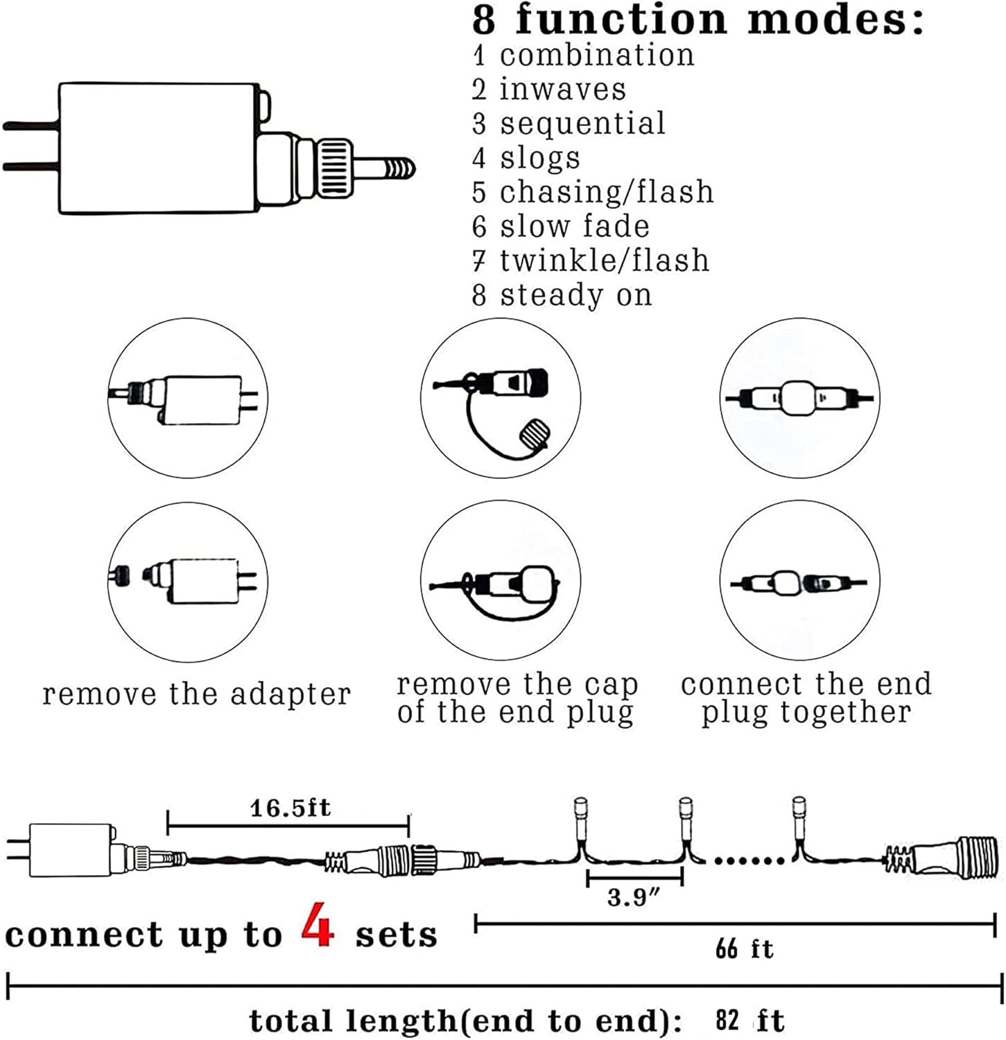 Christmas Decorations String Lights: Package Includes: 2 x 66 ft light string. Each string lights has 200 individual LED bulbs, the lead wire is 16.5 feet, total length is 82.5 ft, and the bulb spacing is 3.9 inches. Each string lights has end-to-end connection, you can connect up to 4 sets together to illuminate a wider range, available for different decorative use.