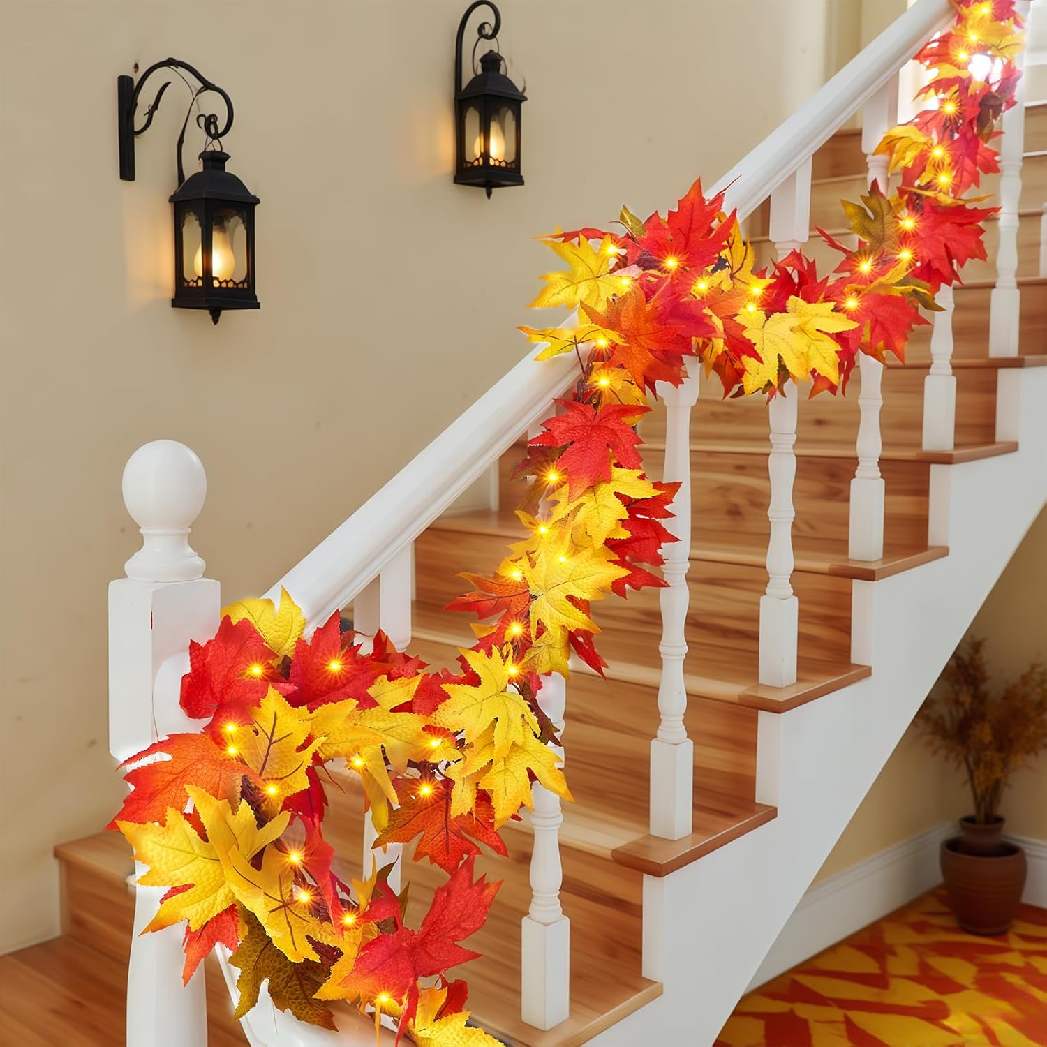 Connectable Fall Garland with Lights: Each fall maple leaves string light has an end-to-end connector, support max 15 sets end to end connected, freely conntected according to your demand. Enough To Cover Larger Area. Whether you only need 1 pack for the mantel, 2 pack draping over a doorframe, or 3 pack for the stair banisters, this garland has you covered. Just use multiple garlands together to create the length you need. Make this Fall colorful not only outside, but inside your home too!