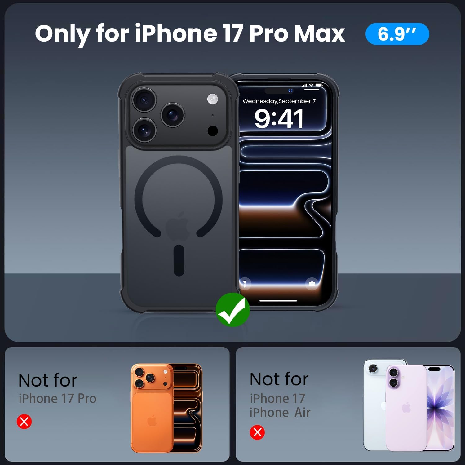 【Compatibility & Package】 ONLY Compatible with iPhone 17 Pro Max case (6.9″). Please check the phone model size before purchasing. The package includes 1 x Magnetic 17 Pro Max Phone Case and 2 x screen protectors.