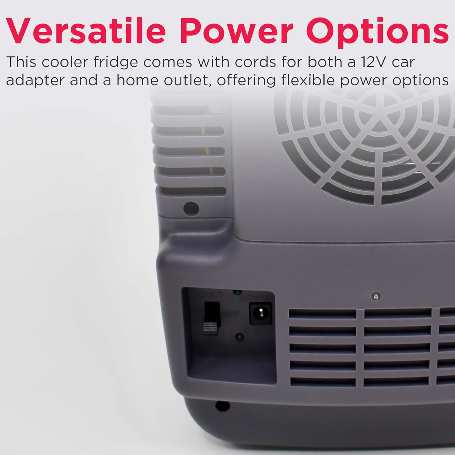VERSTAILE POWER OPTIONS: Equipped with cords for both a 12V car adapter and a home outlet, this cooler fridge offers flexible power options, ensuring you can use it wherever you go.