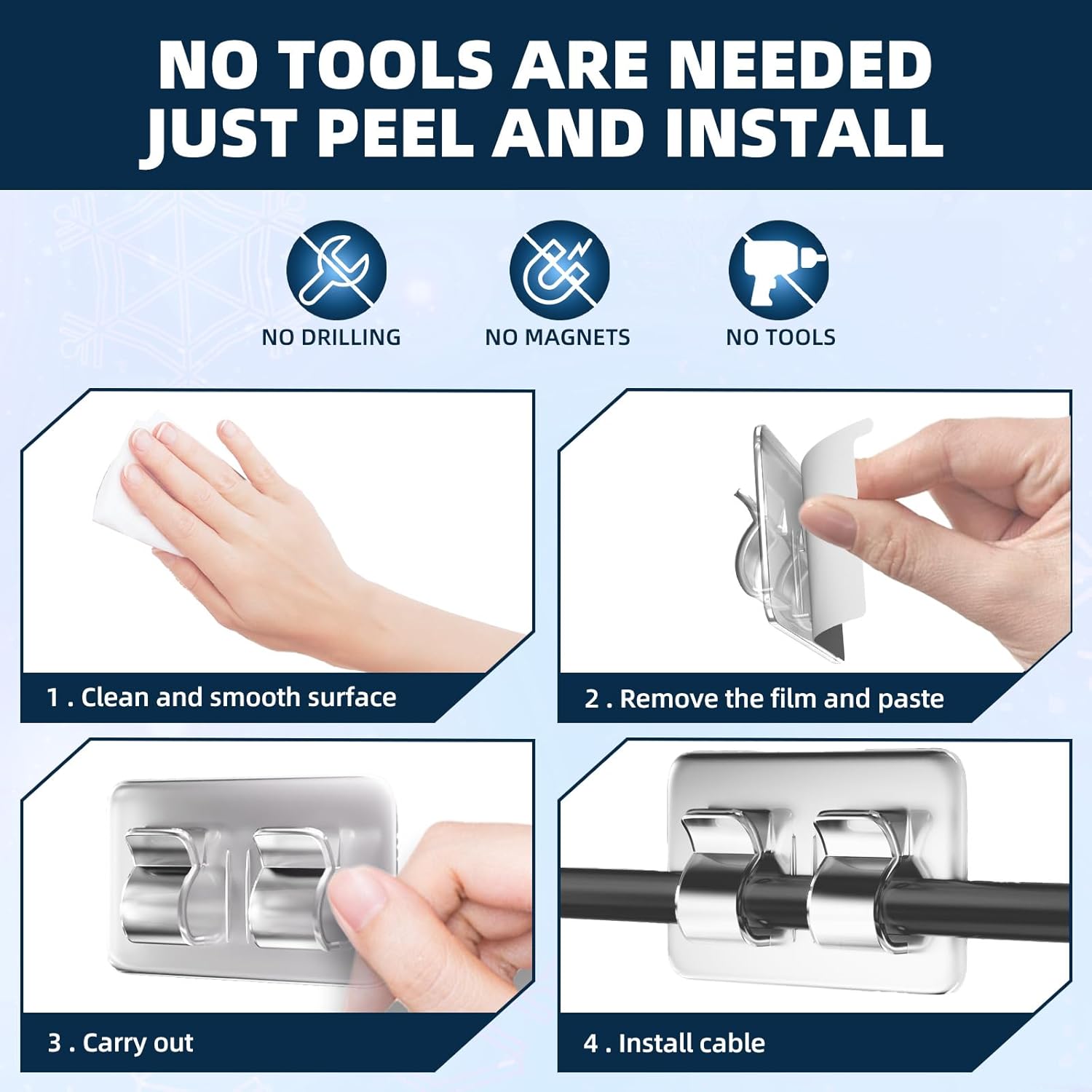 Strong Durable: The upgraded self-adhesive 3m hooks with great adhesion and waterproof, Suitable for indoor and outdoor, whether it is summer or winter, windy or rainy and other bad weather, The cable management clips is convenient for organizing cords of string lights, rope lights or other hanging things to keep these stuff out of mess and in their perfect order