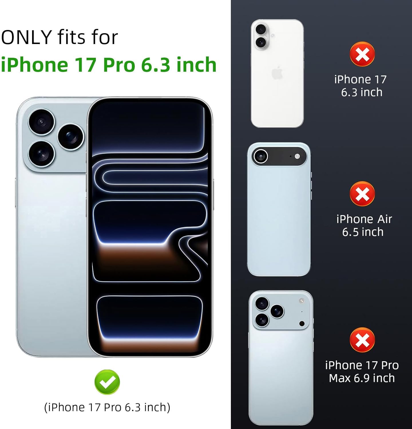 COMPATIBILITY: ONLY fits for iPhone 17 Pro 6.3’’ 2025 Released. Confirm Phone Model from: Settings – General – About – Model Name: iPhone 17 Pro before order, please. Hey, NO Screen Protectors and NO Front Cover!