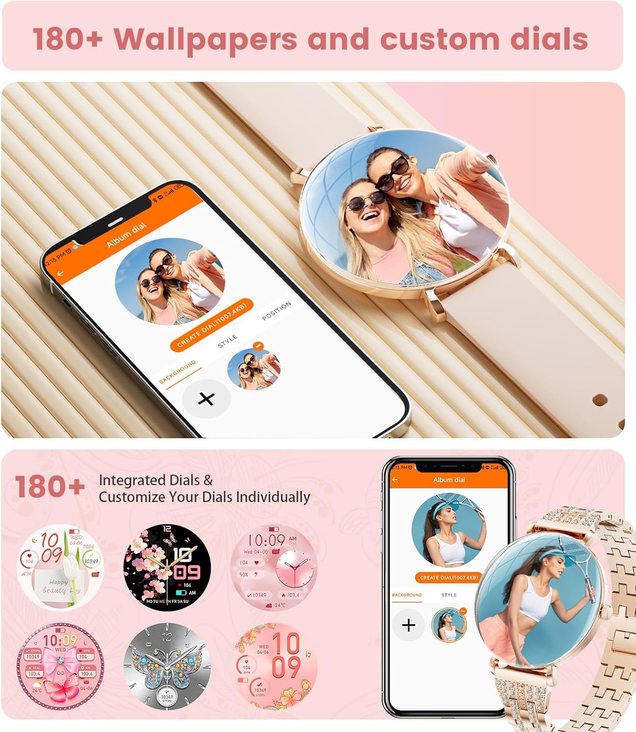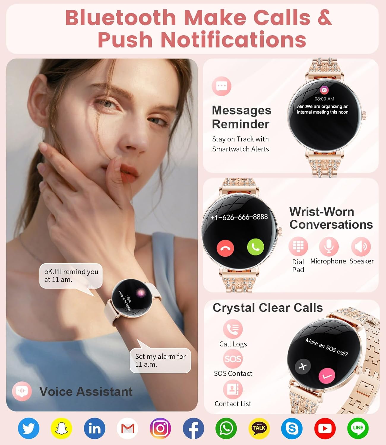 【Stay Connected & Informed, Hands-Free】Our women’s smartwatch offers Bluetooth calling with a built-in microphone and high-fidelity speaker. Connect effortlessly to your phone and handle calls directly from your wrist – receive, reject, or answer with ease. Stay updated with SMS and messages from popular social media platforms like WhatsApp, Facebook, Instagram and more. And during your workouts, you no longer need to take out your phone to check messages.Never miss a vital message again!