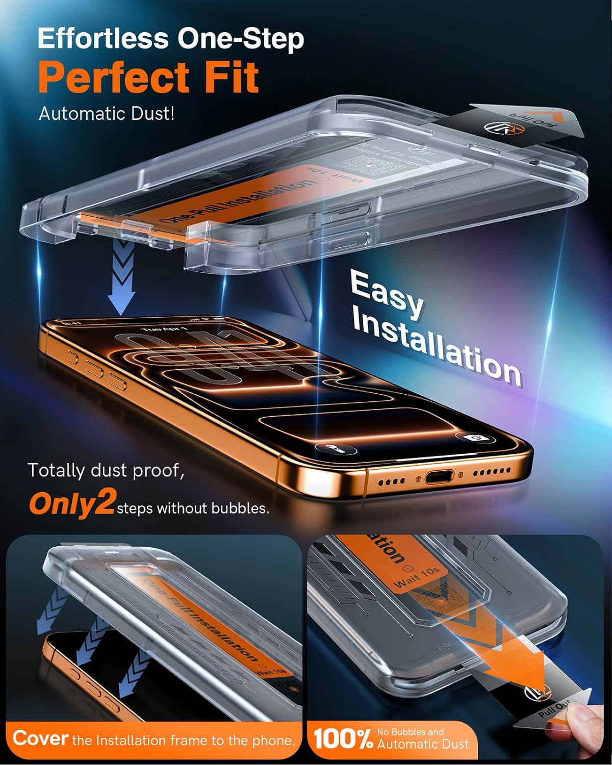 [Super Easy Installation—Just One Pull, One Press] Equipped with a dust-free compartment, you can easily attach the iPhone 17 Pro Max mobile phone film in just a few seconds. You can apply the film perfectly with just one pull and one press. Auto-Installation, Auto-Dusting, Bubbles-Free, say goodbye to annoying steps and enjoy the crystal clear screen.