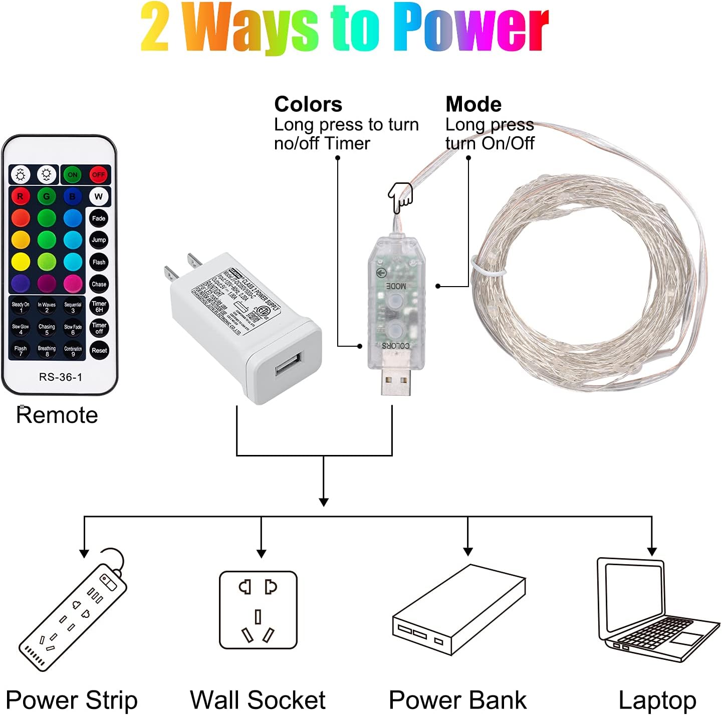 Compared with the similar string lights on the market, our color changing lights come with a power adapter which is convenient if no USB port is available.The USB plug lets you to plug the string lights into the USB hub, power adapter, laptop, TV or power bank.