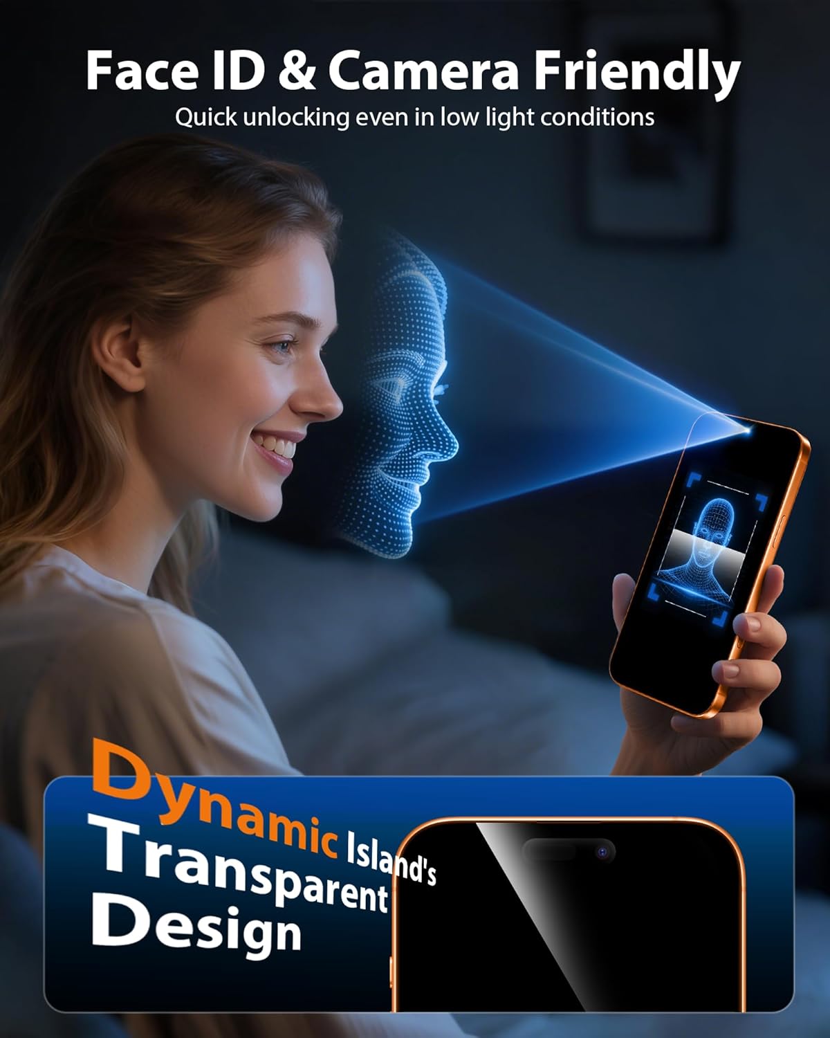【Face Unlocking Compatible】0-lag Face ID recognition enabled by laser-etched micro-holes and ultra-thin 0.3mm design. AGAR anti-reflective coating pro max privacy screen protector prevents light interference, ensuring <0.9s unlock speed even in low light or direct sunlight