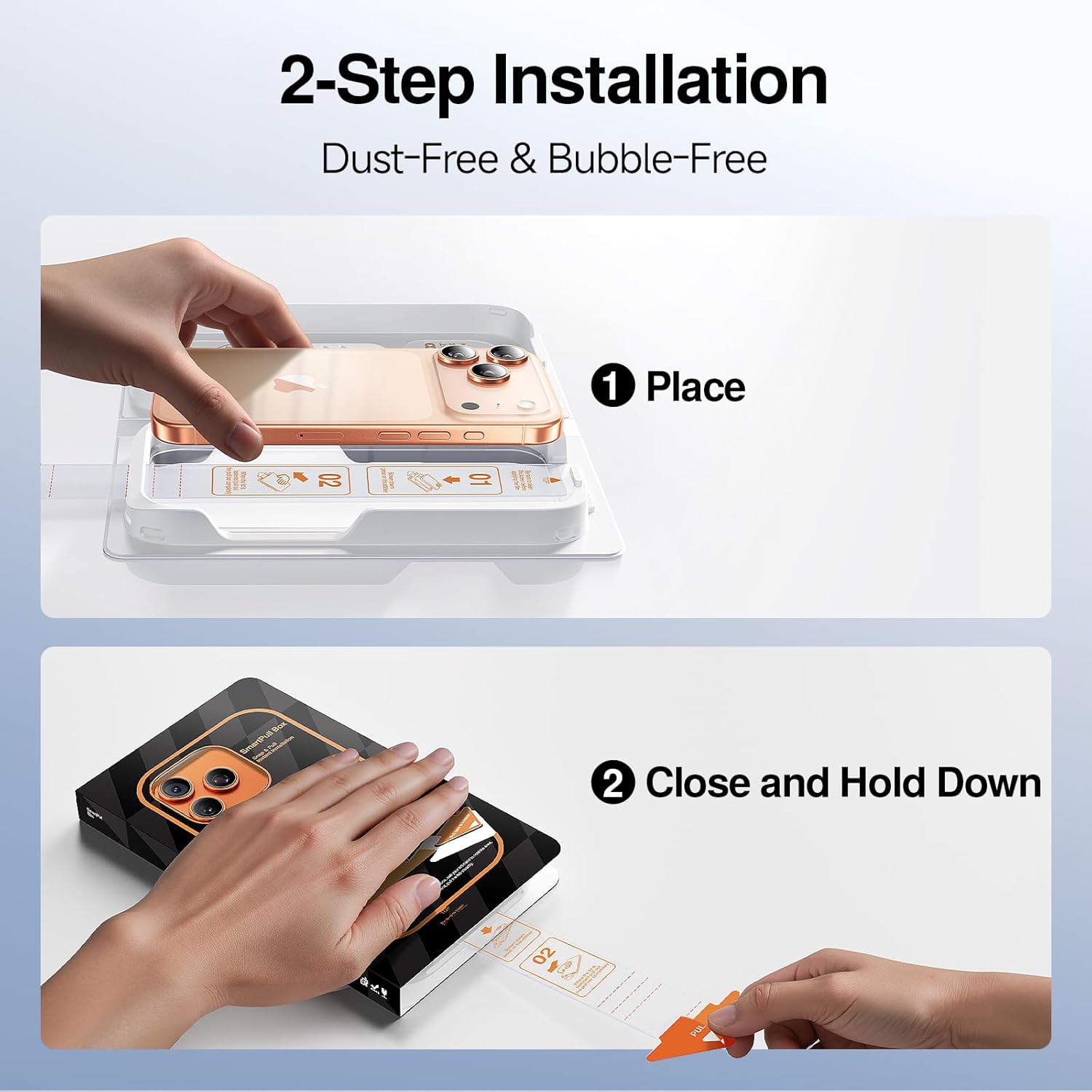 【Easy Installation and Smudge Free 】 First, place the screen facing down, press it onto the pull tab, then close the cover and hold it down to secure it, and finally fully pull out the pull tab.