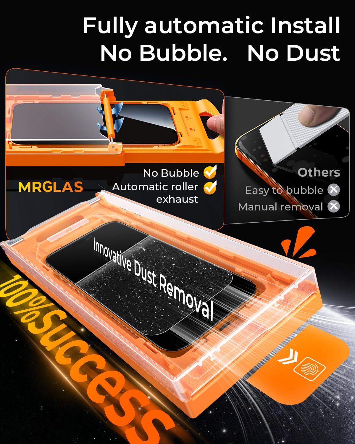 【Upgrade Auto Dust Removal】Specialising in designing for iPhone 17 Pro Max screen protector with the new upgraded auto dust removal technology, 5X strong adsorption power, truly 0 dust! Simply place the device in the installation cabin, auto alignment, cover the lid, pull out the dust absorbing strip to complete the automatic dust removal, no need for tedious cleaning steps, no longer need to worry about airborne dust caused by the failure of the film.