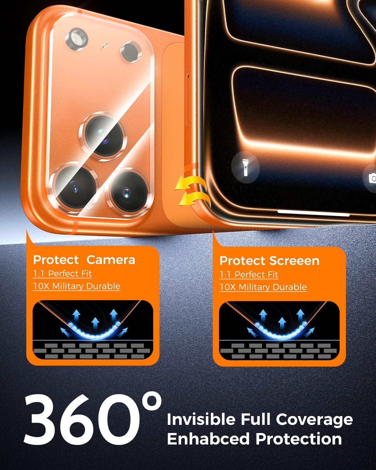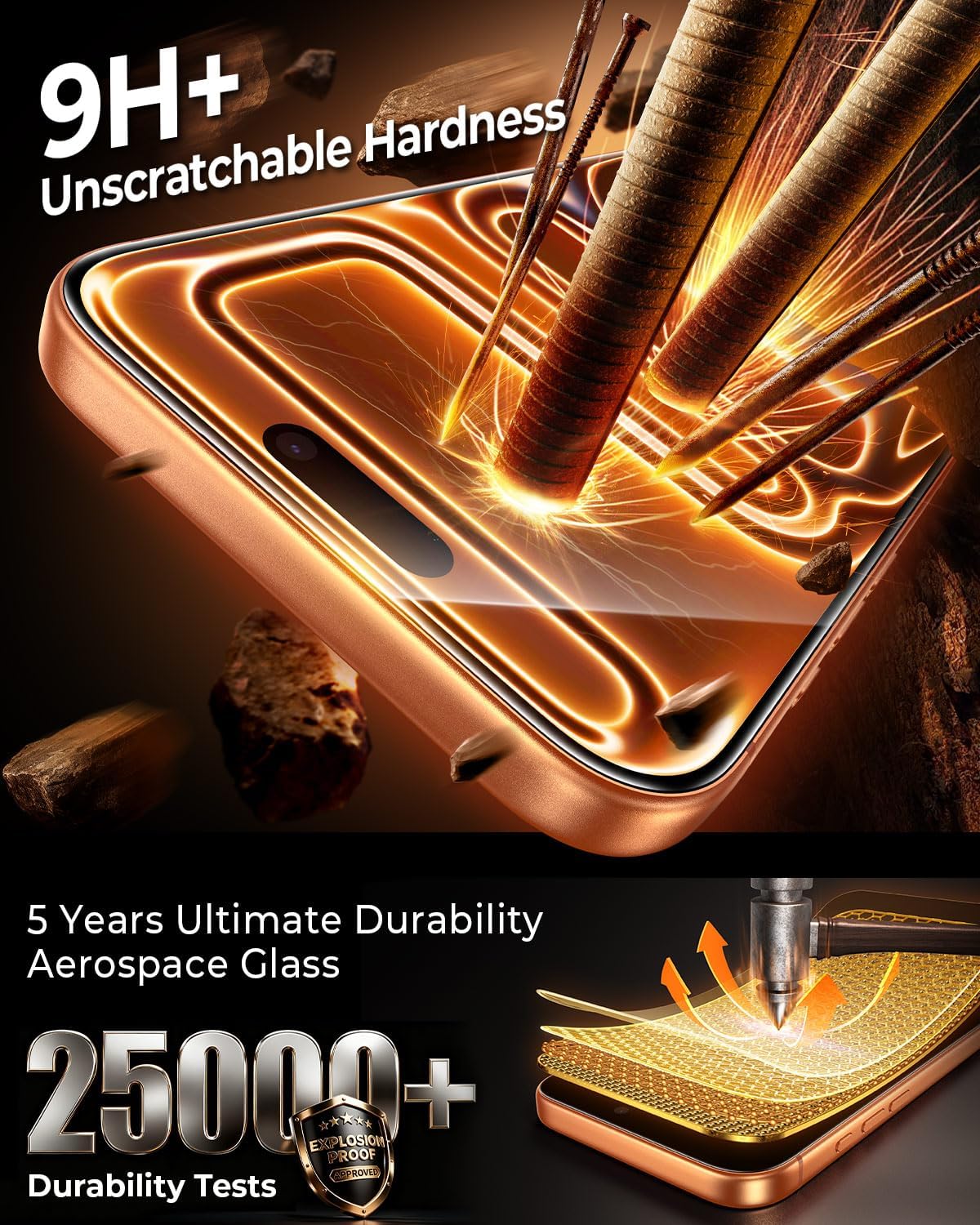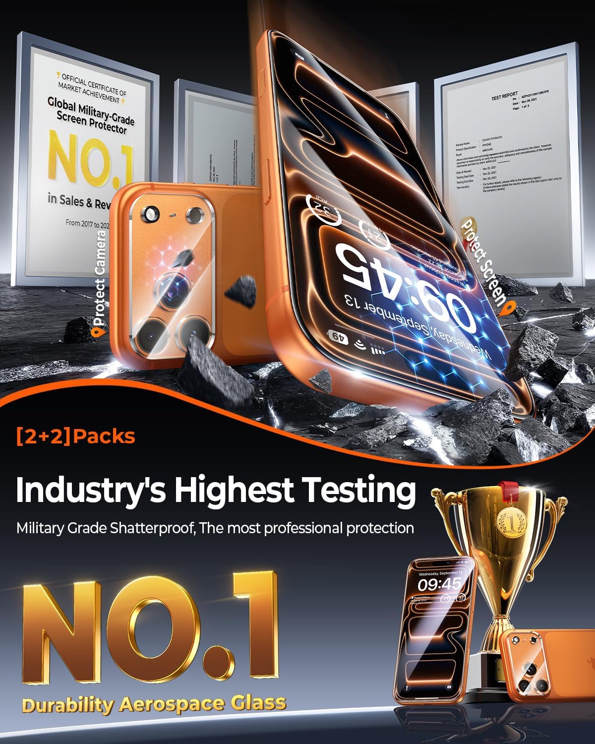 【Industry NO.1 Military-Grade Shatterproof】Authorized by the international Military Standard with 50+ rigorous engineering tests of 220 lbs impact, 8,000+ drop tests, 20,000+ scratch tests, etc., its strength, toughness and durability perform NO.1 among all glass. By especially breaking the industry’s record with a 12-foot drop, the screen protector for iPhone 17 Pro Max is ensured to be unbreakable from its surface to every edge and corner.