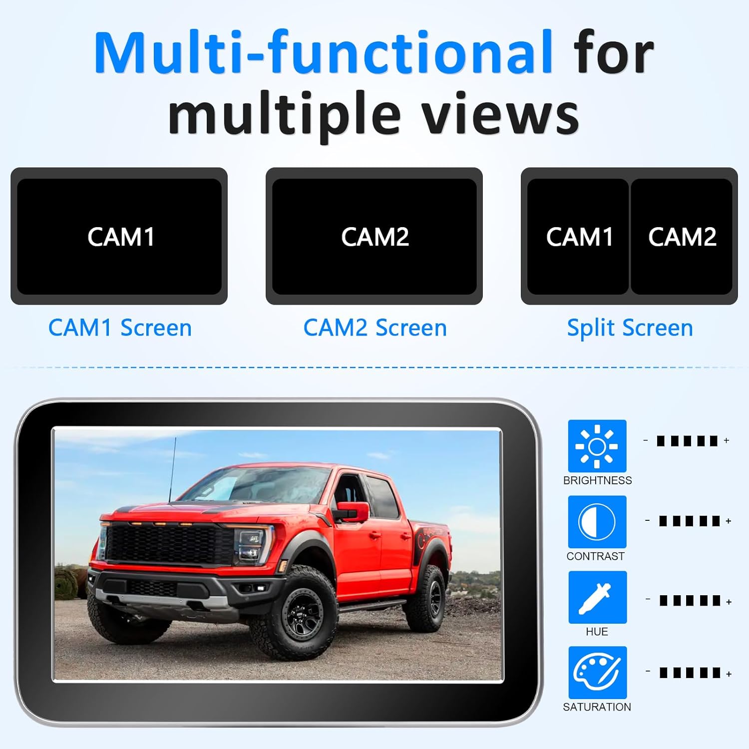 2 CHANNELS MONITORING: Boost your truck’s safety with our dual channel system. Monitor both your truck simultaneously from a single 7-inch HD display, providing comprehensive coverage and significantly reducing blind spots for safer driving and maneuvering